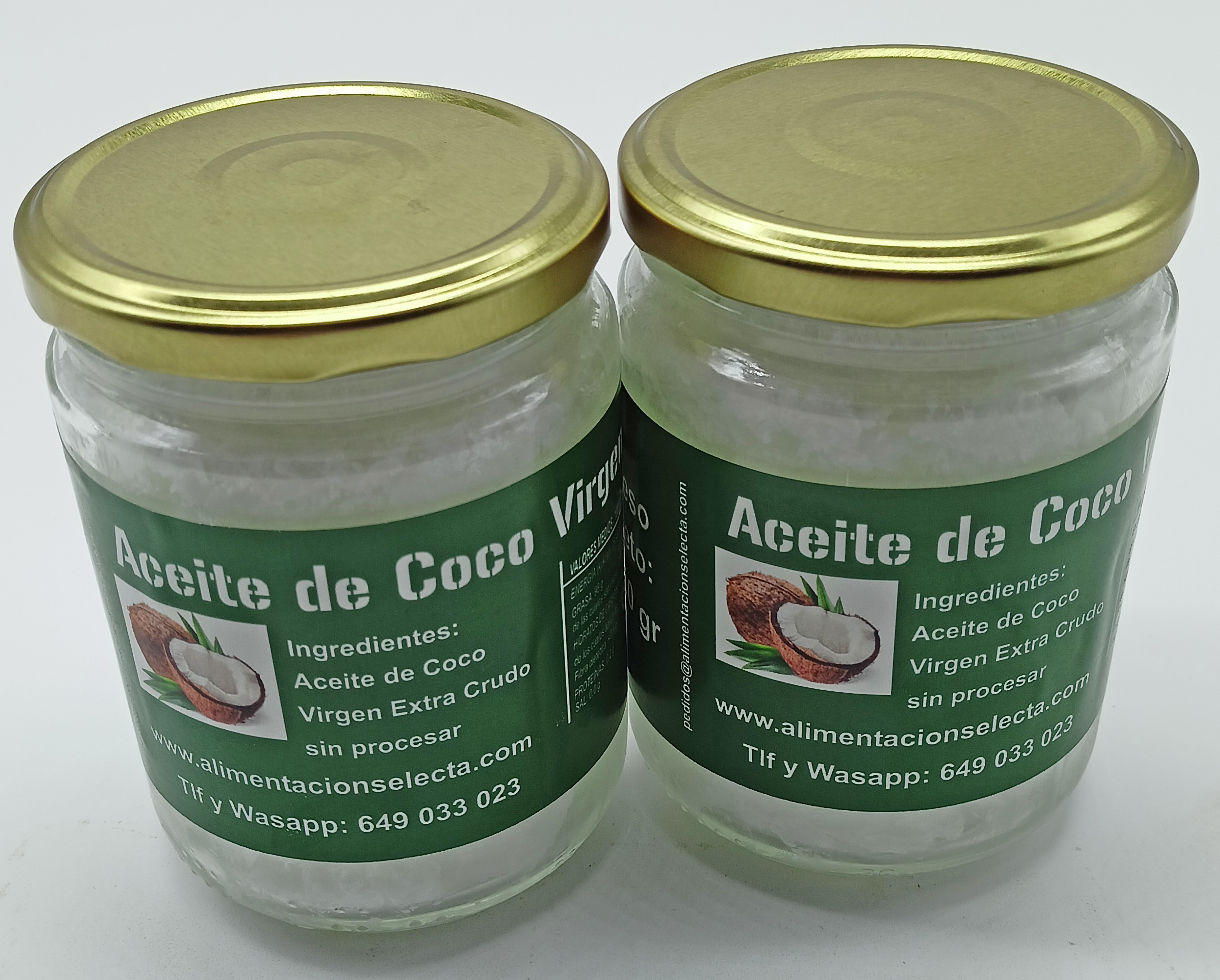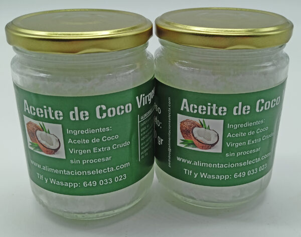 Comprar el Mejor Aceite de Coco Virgen Extra en 2 tarros de cristal con 900 gr netos del Mejor Aceite de Coco Virgen Extra para cocinar, hornear, freir, elaborar batidos, aderezar ensaladas y como el mejor humedectante para el cuidado del cabello Este Aceite de Coco Virgen Extra crudo ha mantenido en todo momento las temperaturas de su procesamiento por debajo de los 45º C para que de esa manera retenga todas las vitaminas y minerales que le confieren un sabor y propiedades únicas a la hora de cocinar o cuidar su cabello
