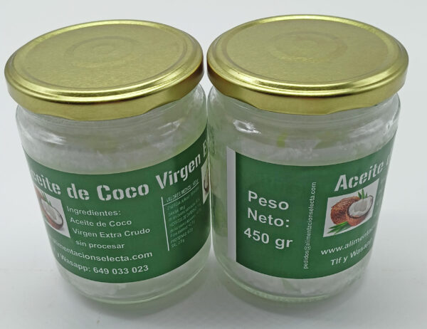 Esta oferta para comprar el Mejor Aceite de Coco al Mejor Precio se contiene 2 tarros de cristal de 450 gr cada uno total 900 gramos del Mejor Aceite de Coco de España